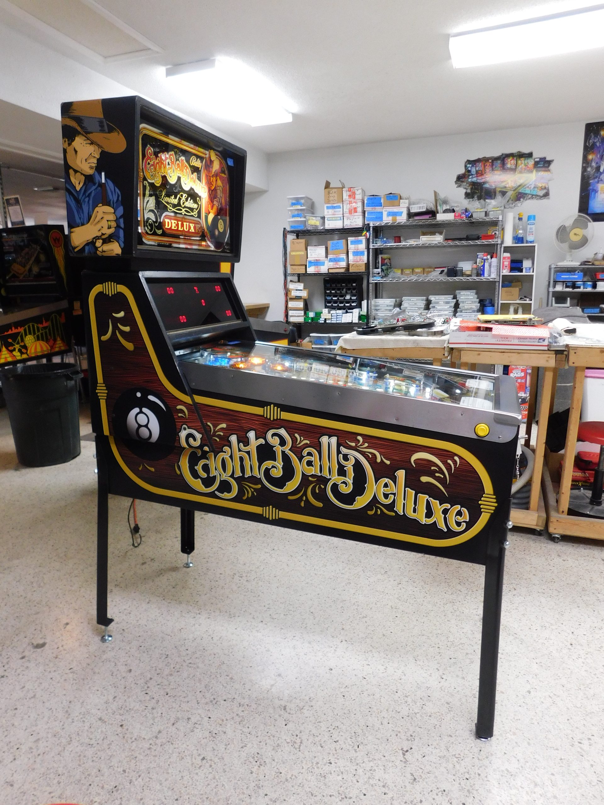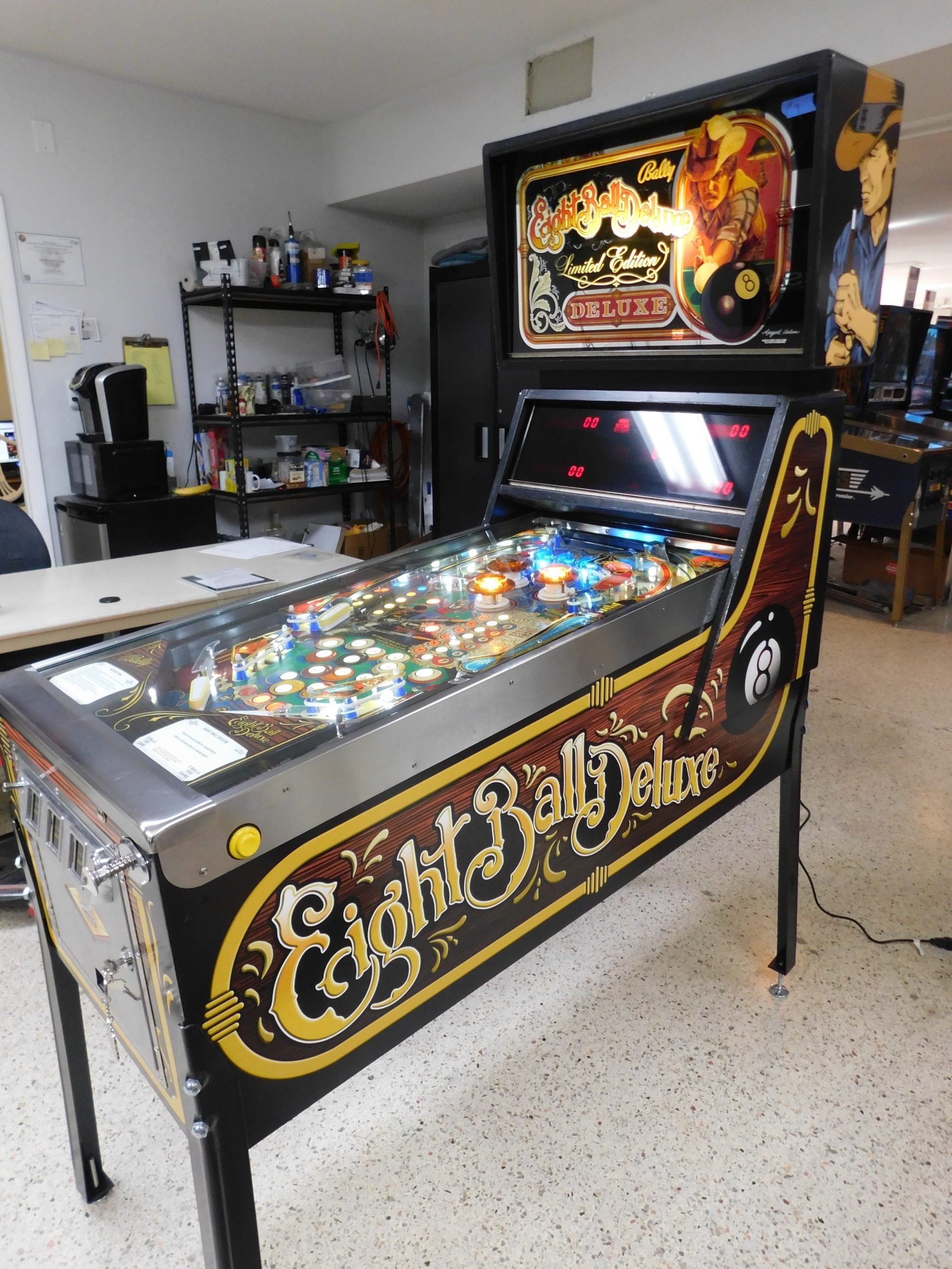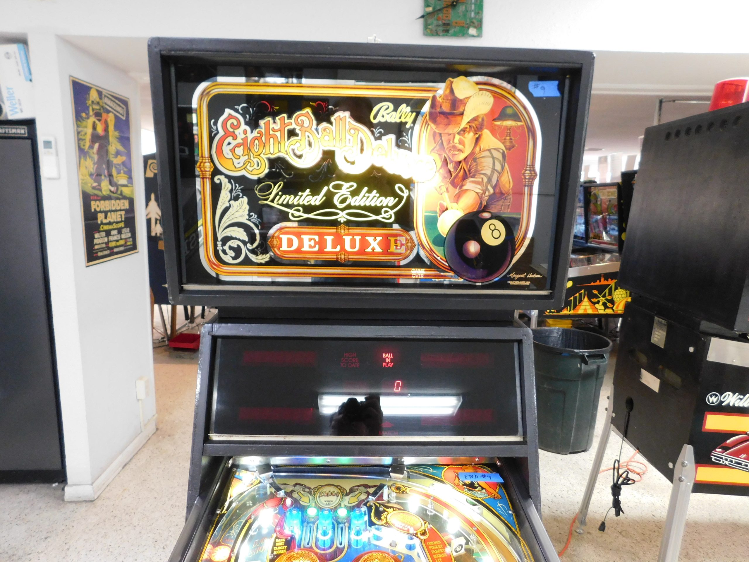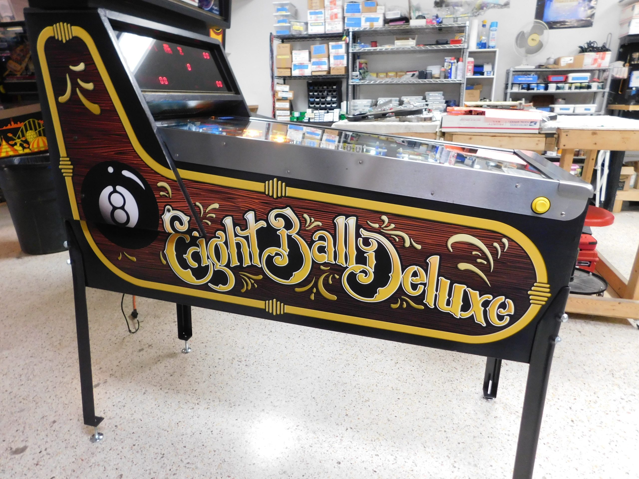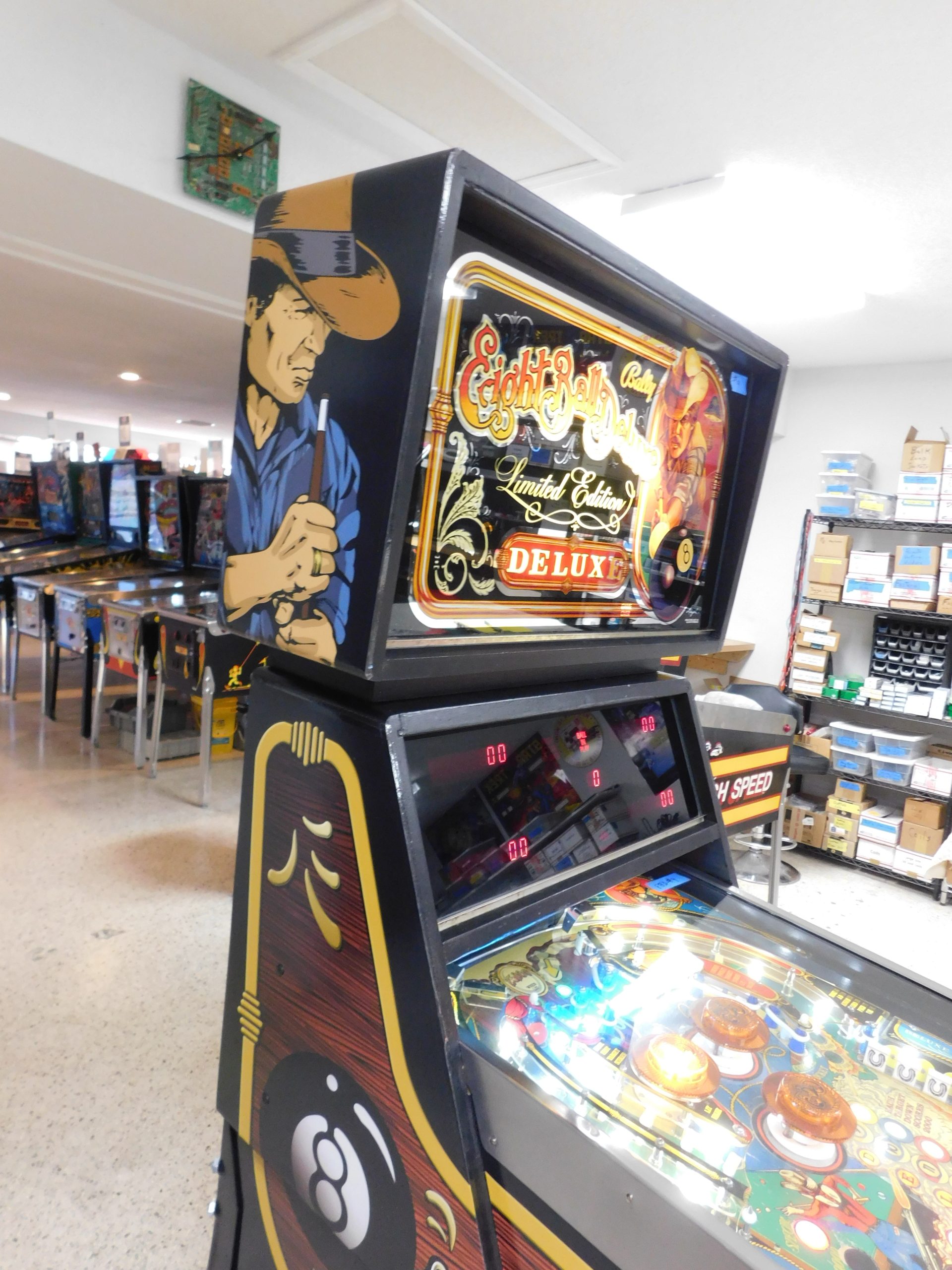 SOLD – 1982 Bally Eight Ball Deluxe – Limited Edition (#9) (Beautiful new CUSTOM cabinet artwork, new Alltek MPU board, new Alltek Solenoid Driver board, new Alltel Auxiliary Lamp Driver board, new playfield glass)