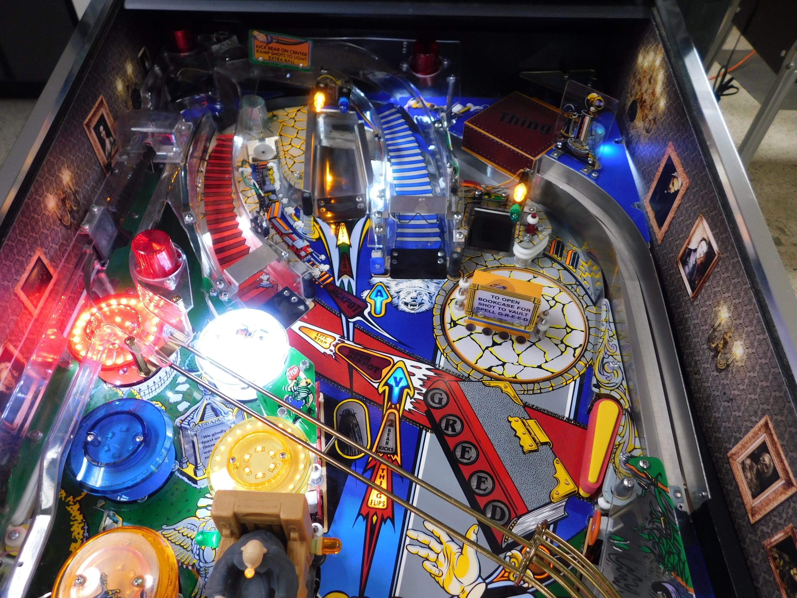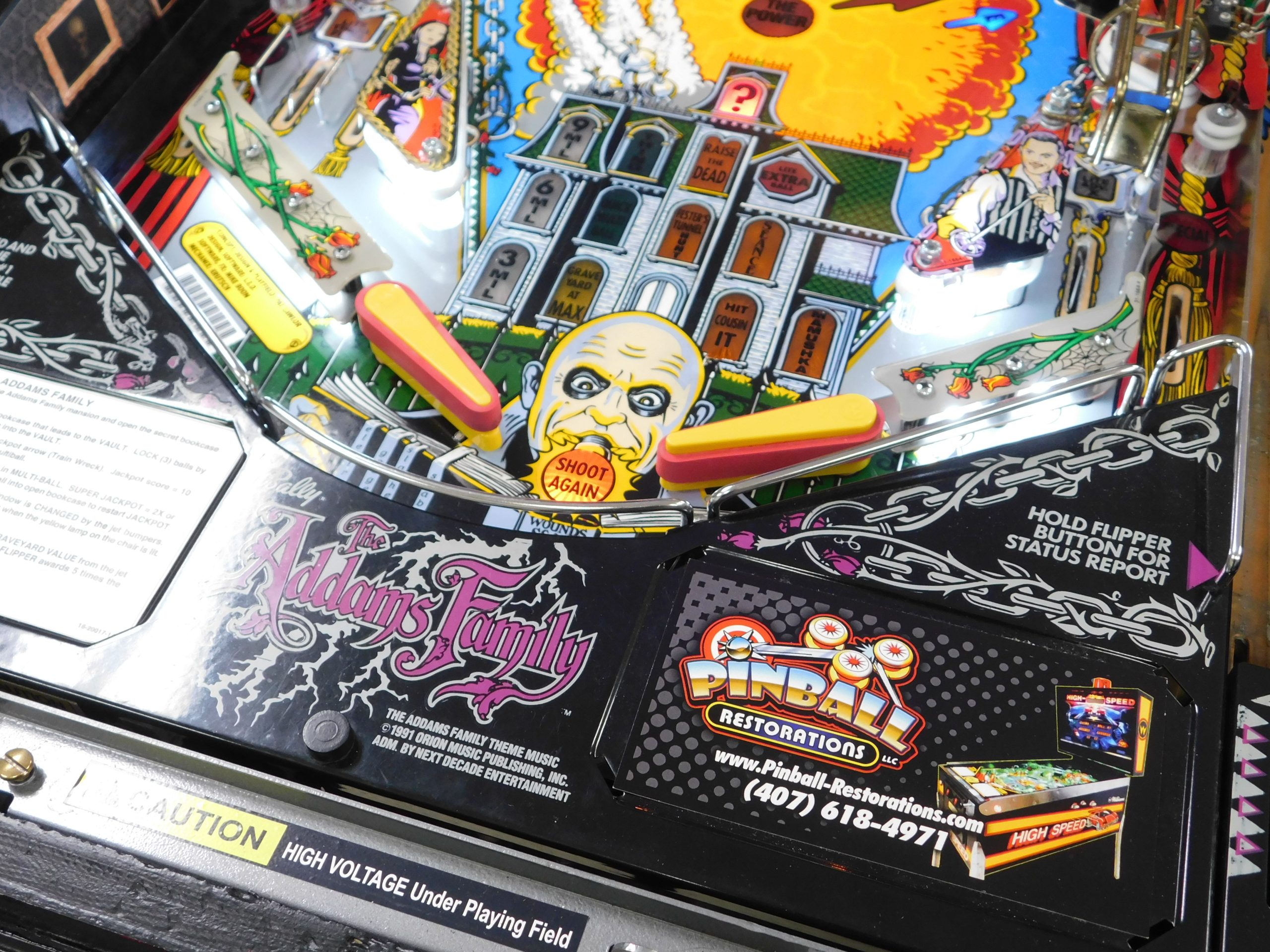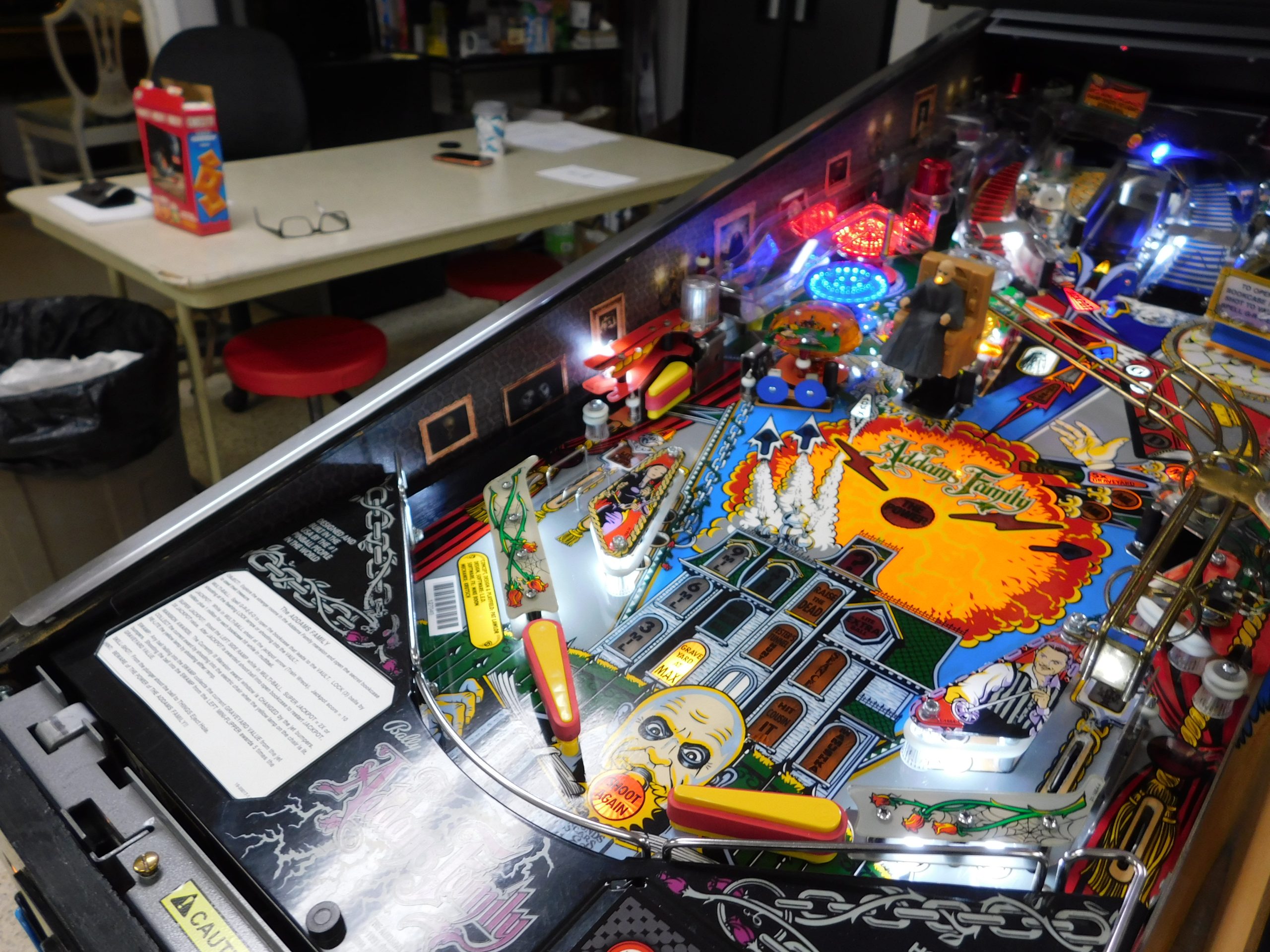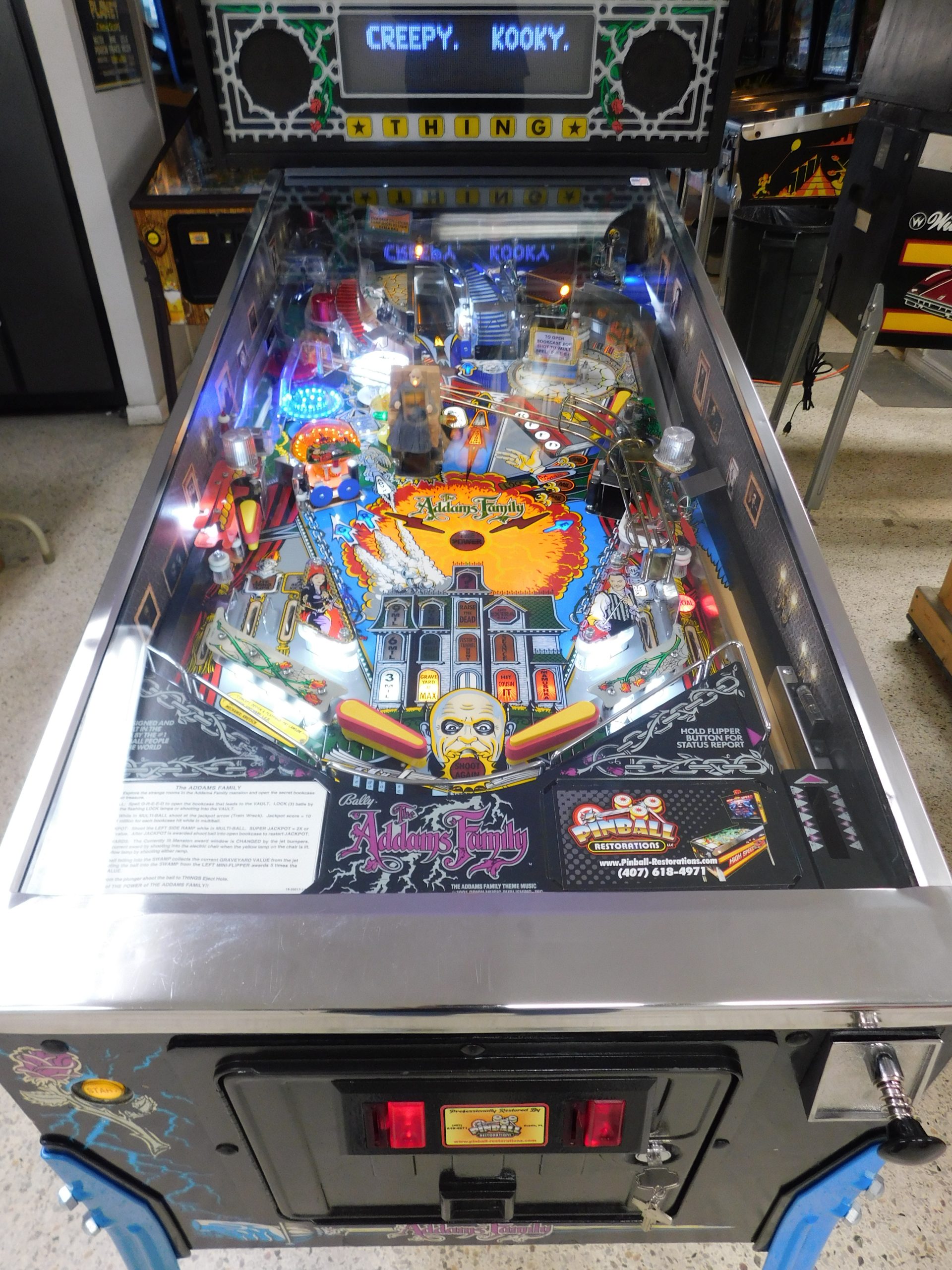 SALE PENDING – 1992 Bally Addams Family (#3) (# ball Multi-ball) (Excellent condition) (New head decals, Thing box decal, Bookcase decal & color DMD)