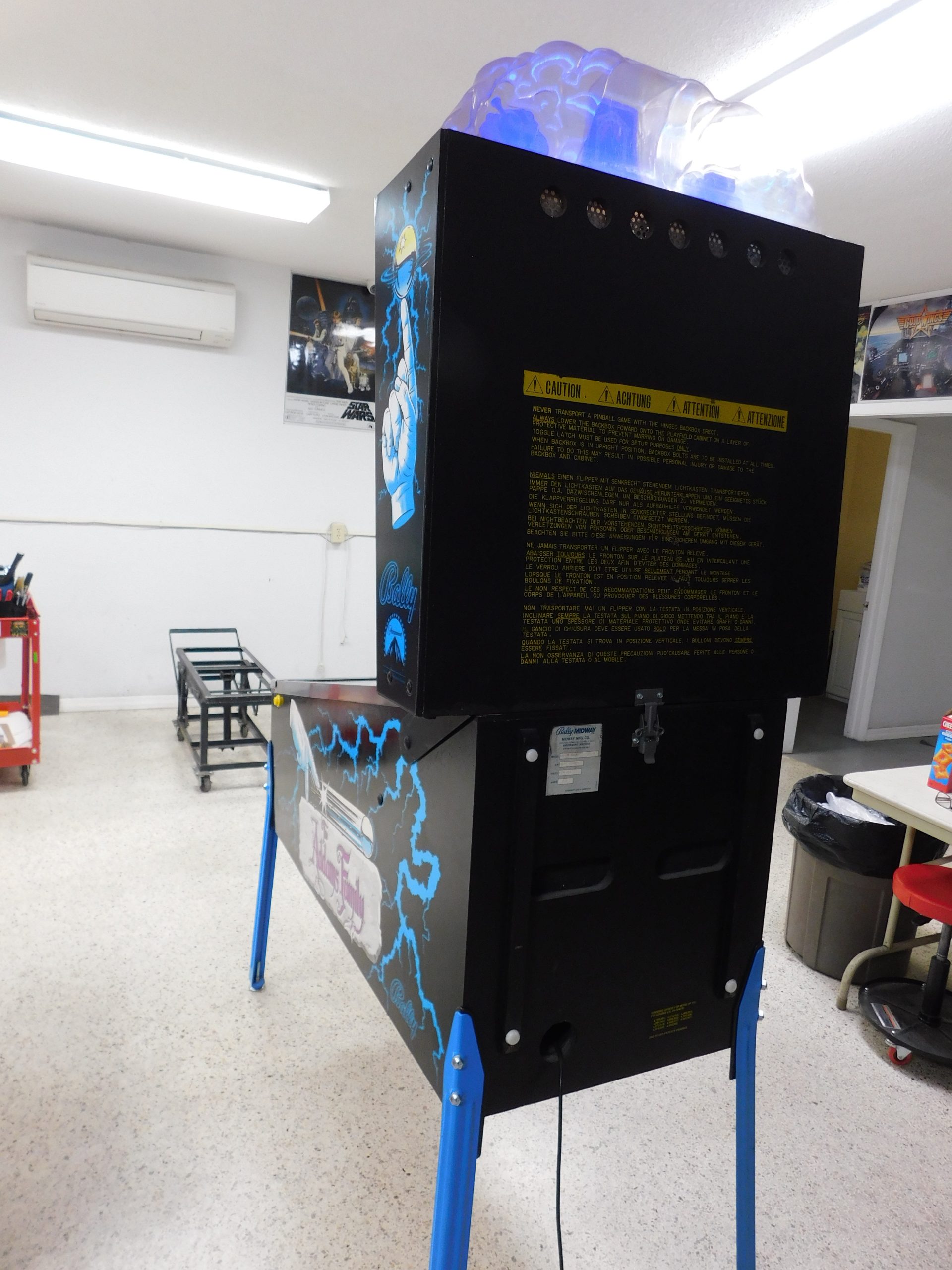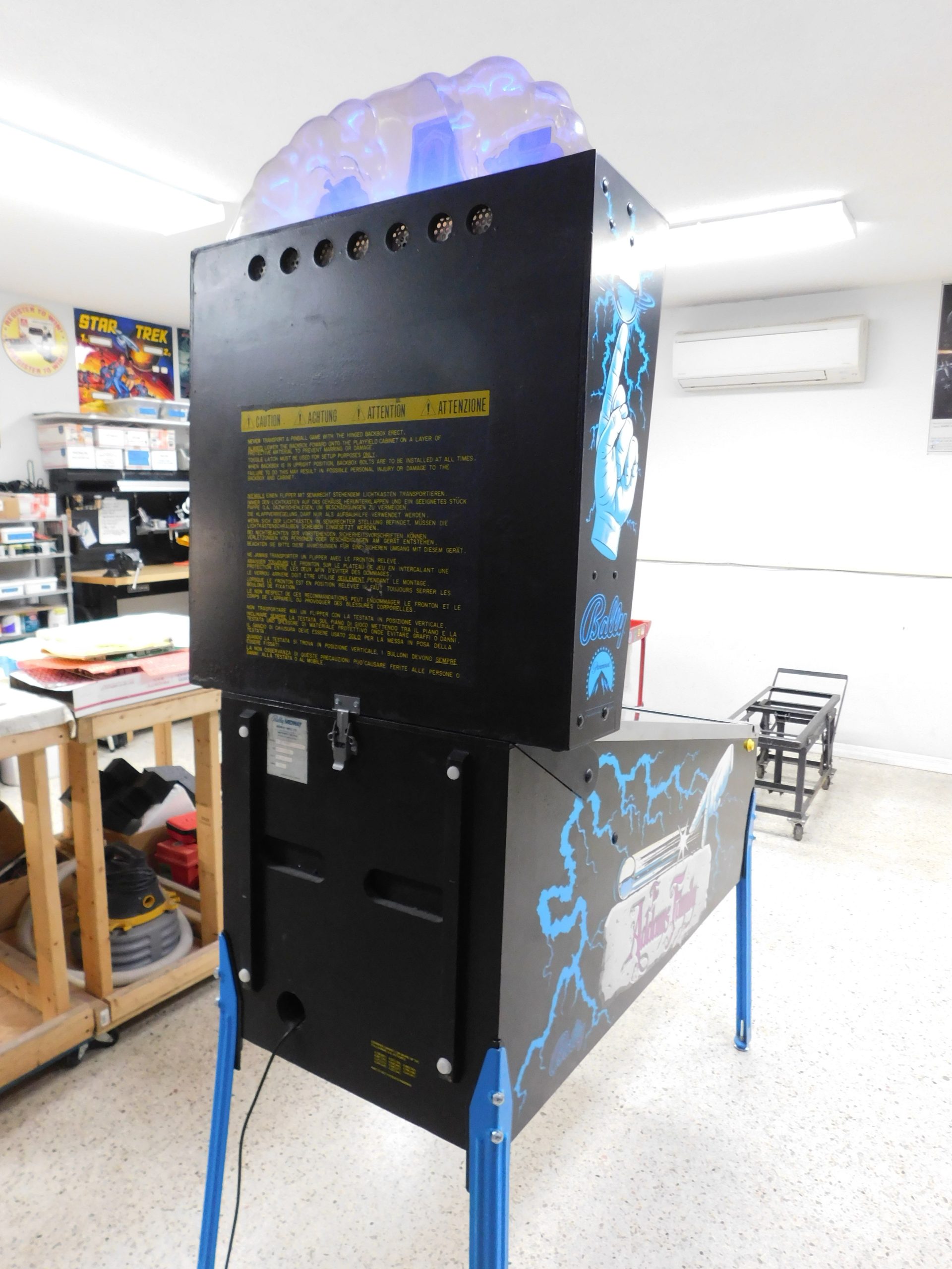 Legs were cleaned and painted blue, new leg bolts and leg adjusters were installed. All boards were removed and serviced for reliability. Batteries were replaced with NVRAM chip. Backbox sides had typical damage to them. Wood was filled and sanded, painted then new decals were applied. Game was vacuumed inside and washed inside and out. Original power cord was replaced for safety.