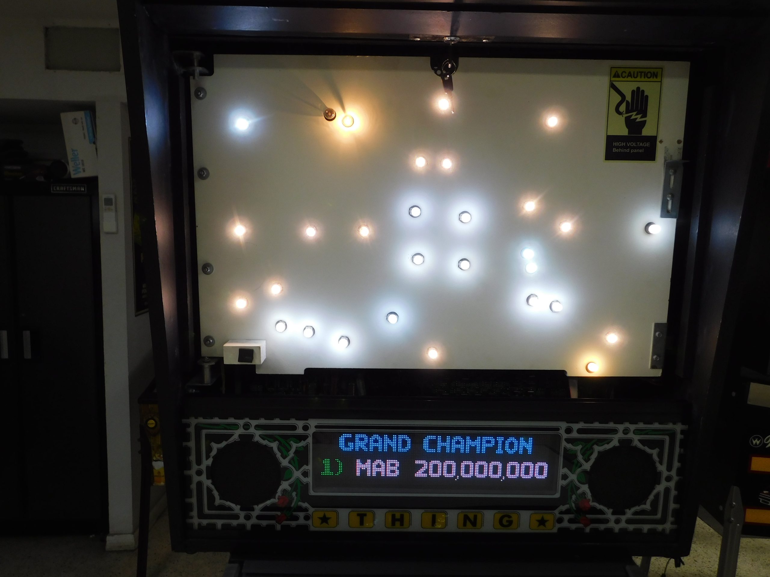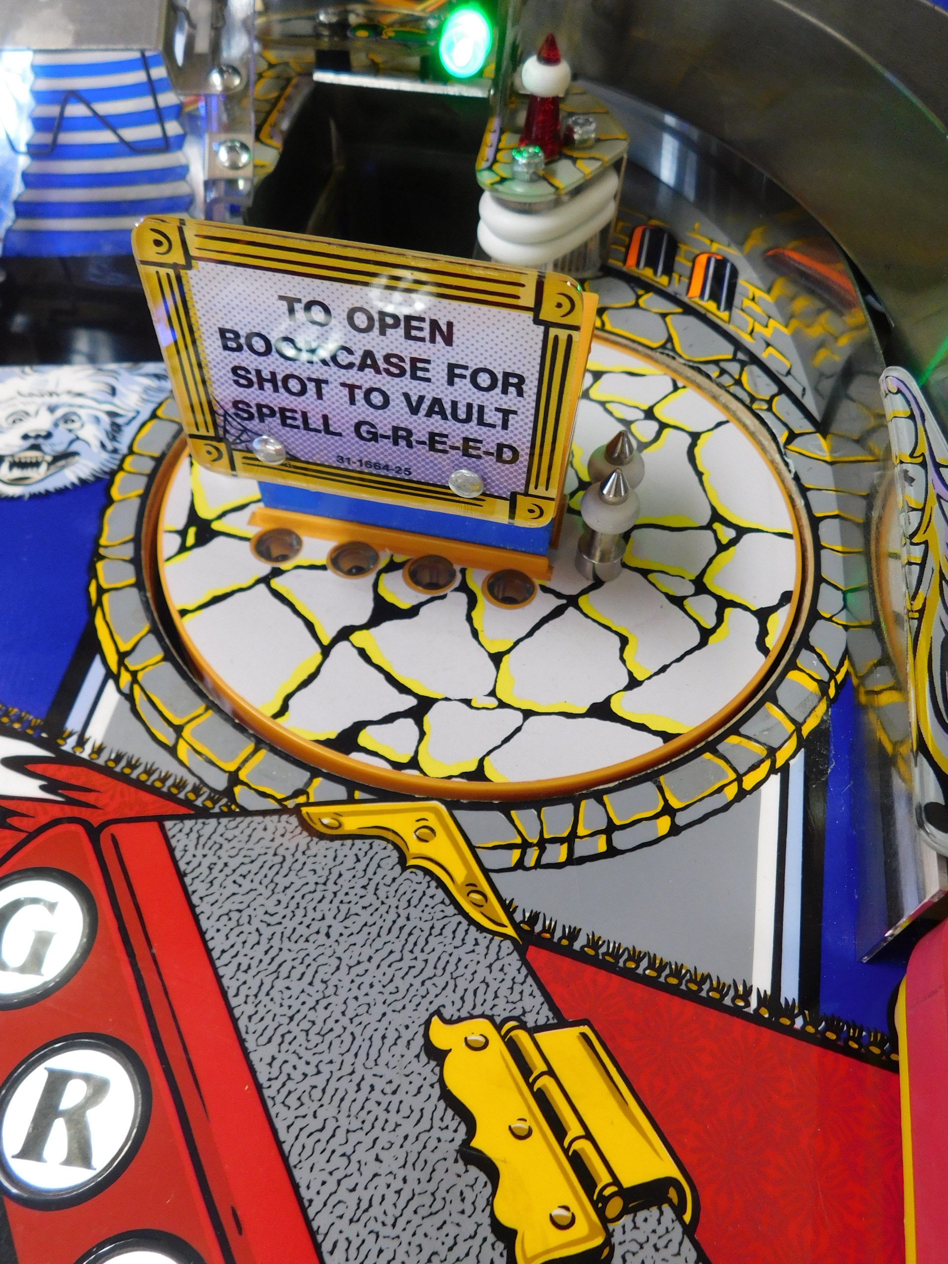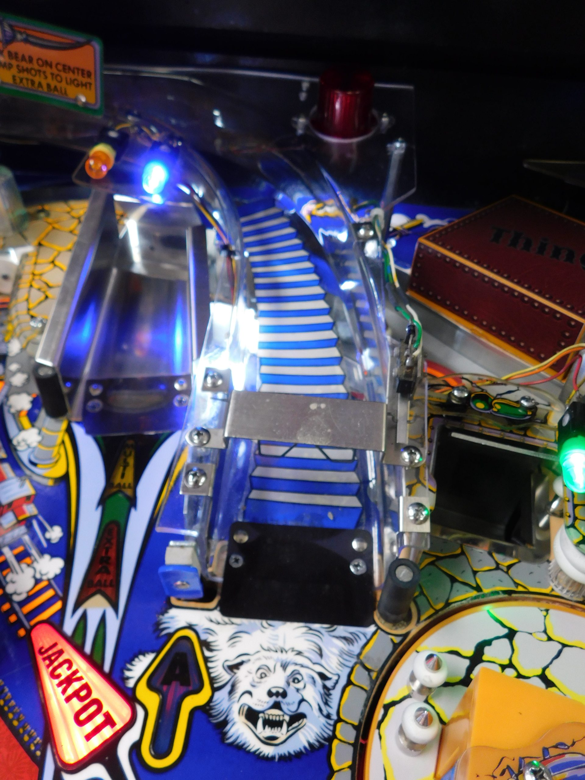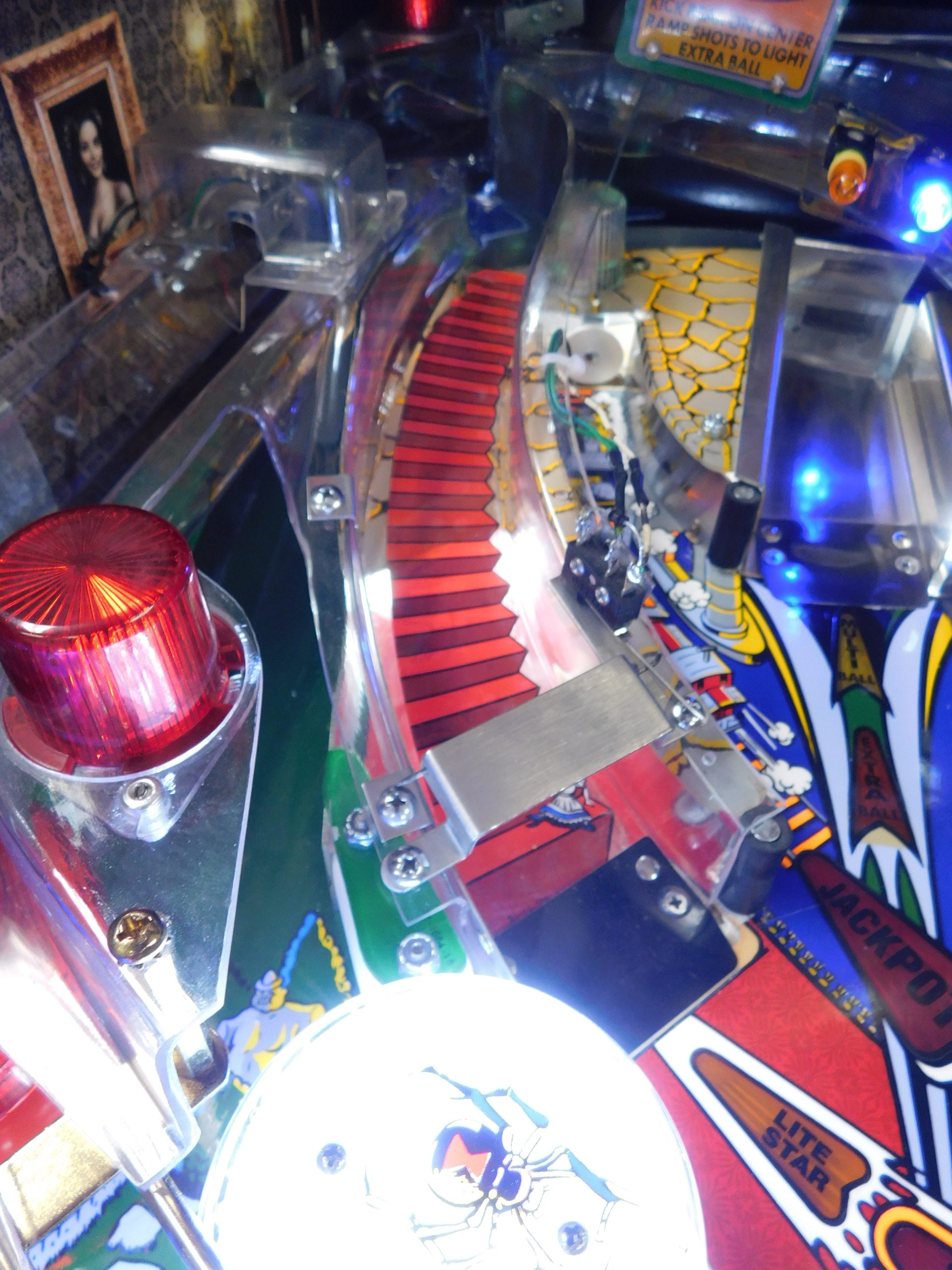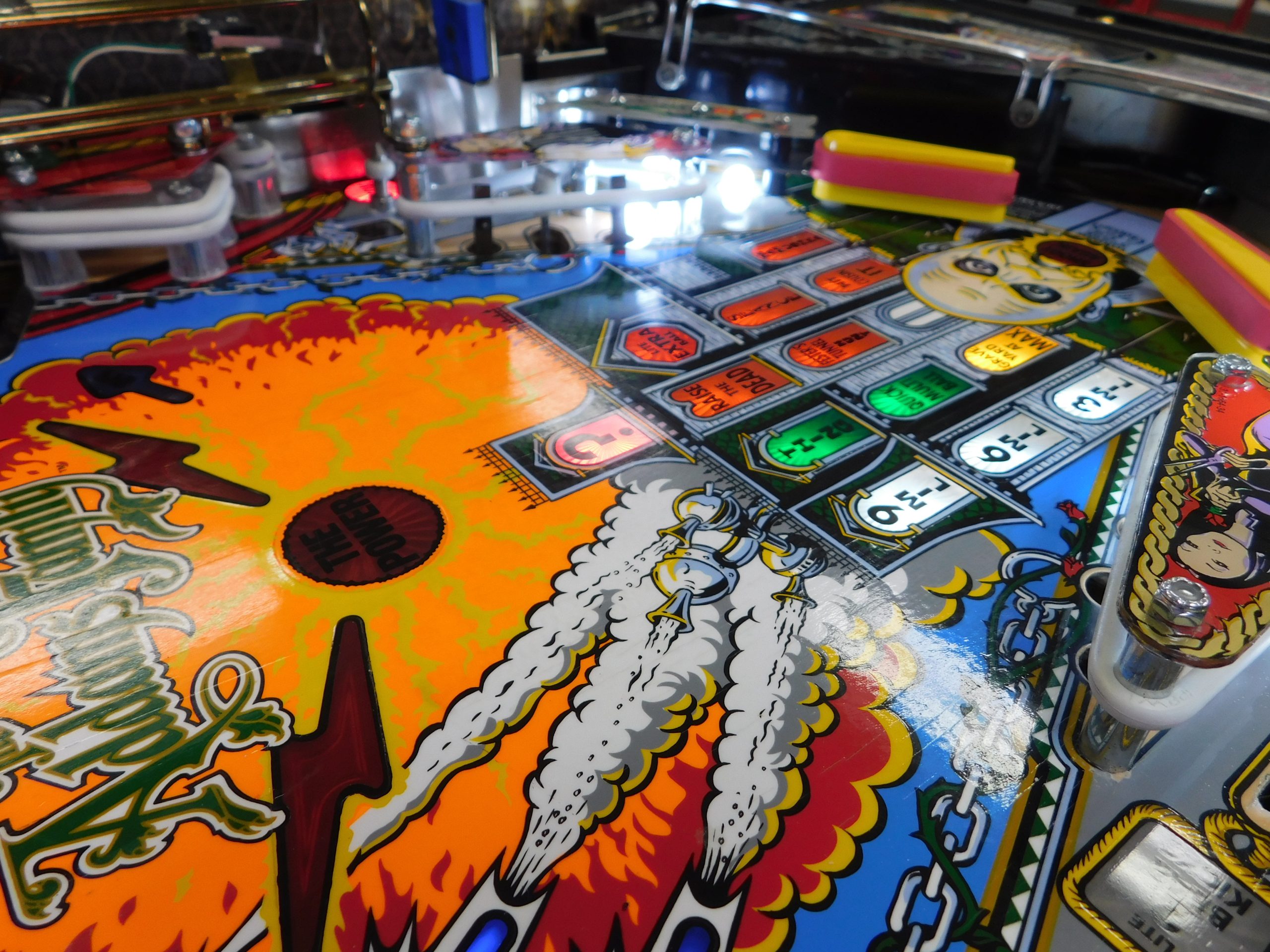 Playfield was disassembled, cleaned and polished. All playfield plastics and metal were washed and polished. Game was converted to LED bulbs. All playfield posts were replaced with new, all playfield inserts were cleaned underneath to remove EMF dust. Bumper lights were upgraded with EVO light rings. All flippers and bumpers were fully rebuilt with new parts above and below the playfield. New rubber bands.