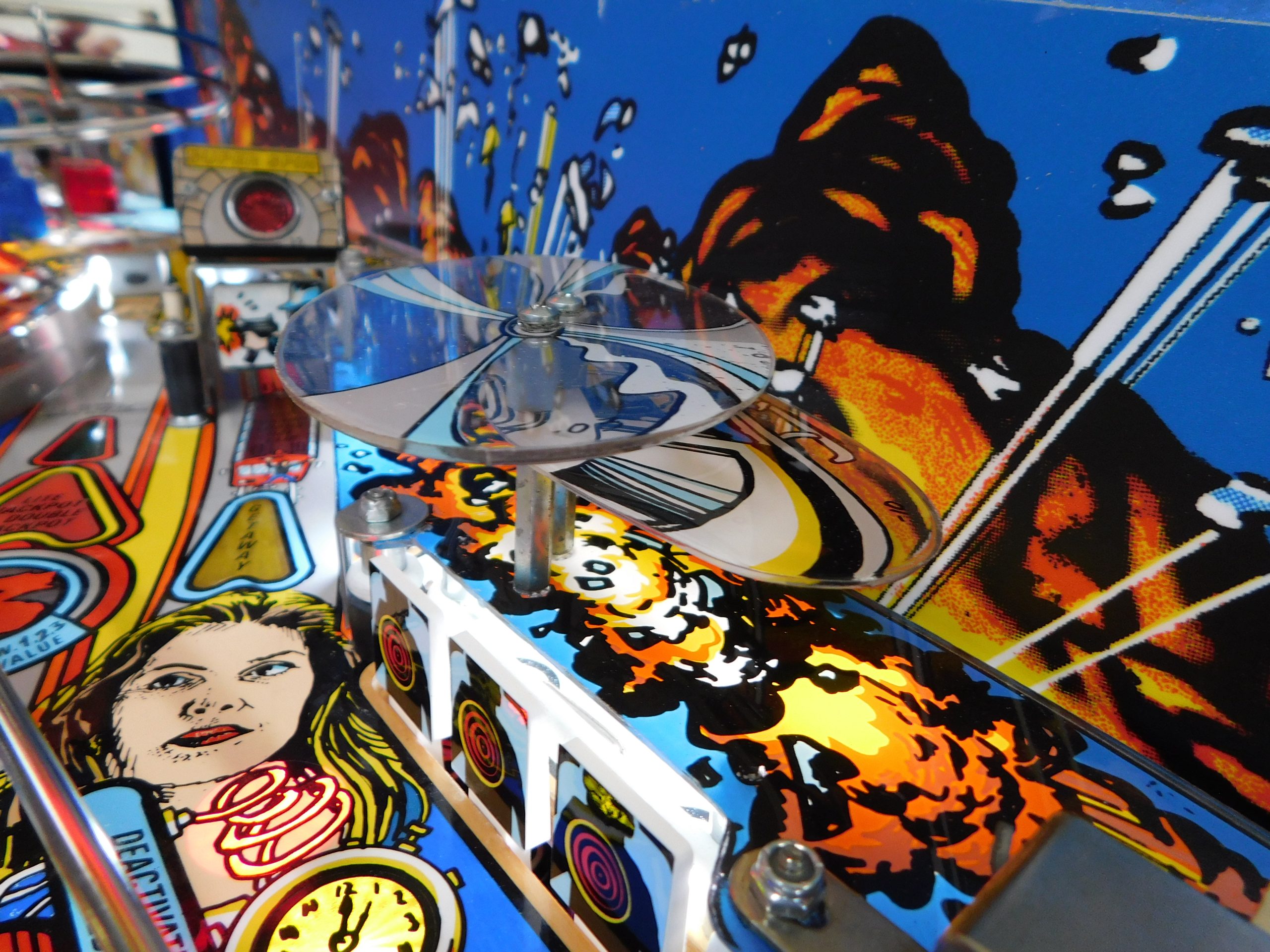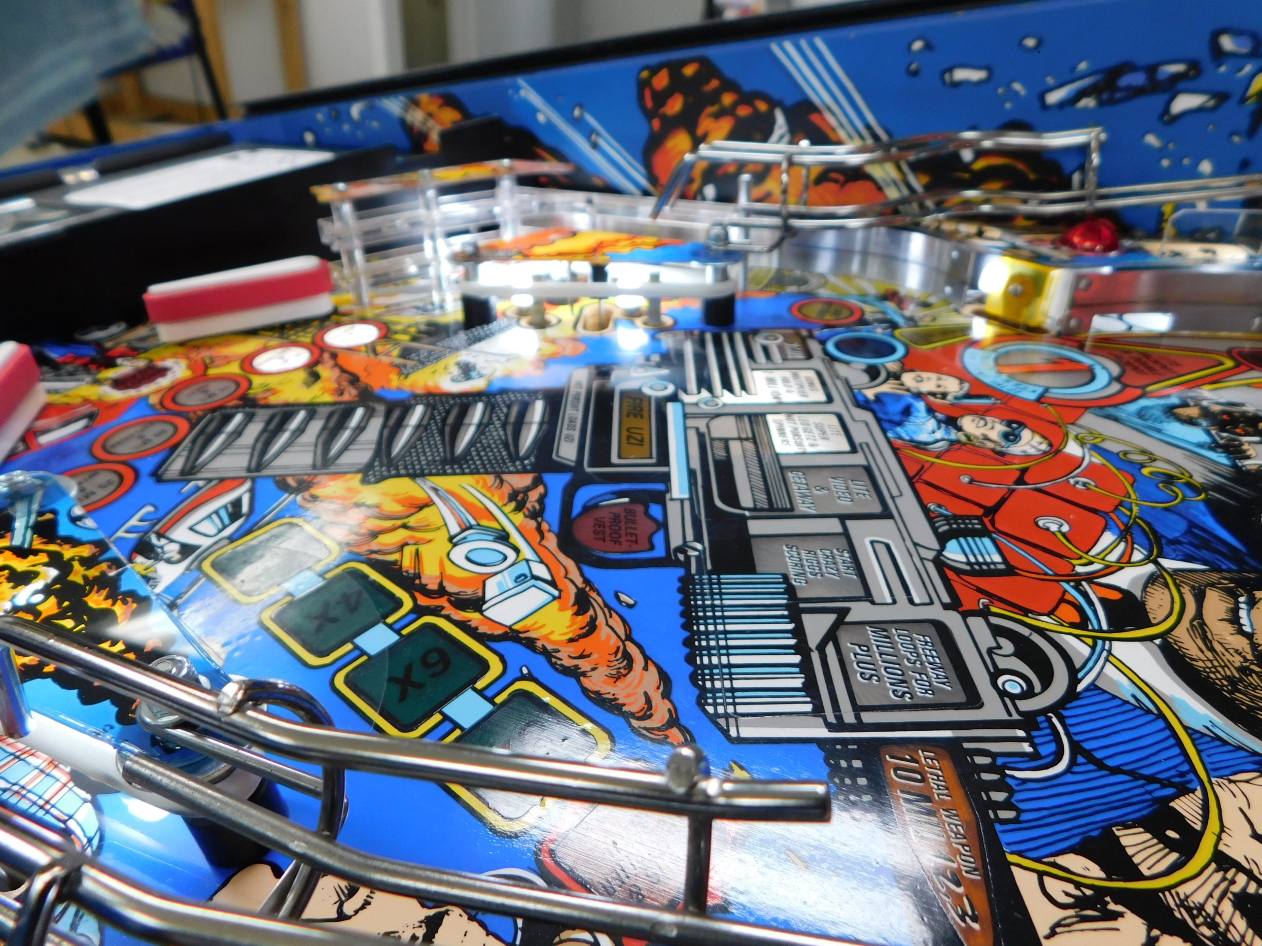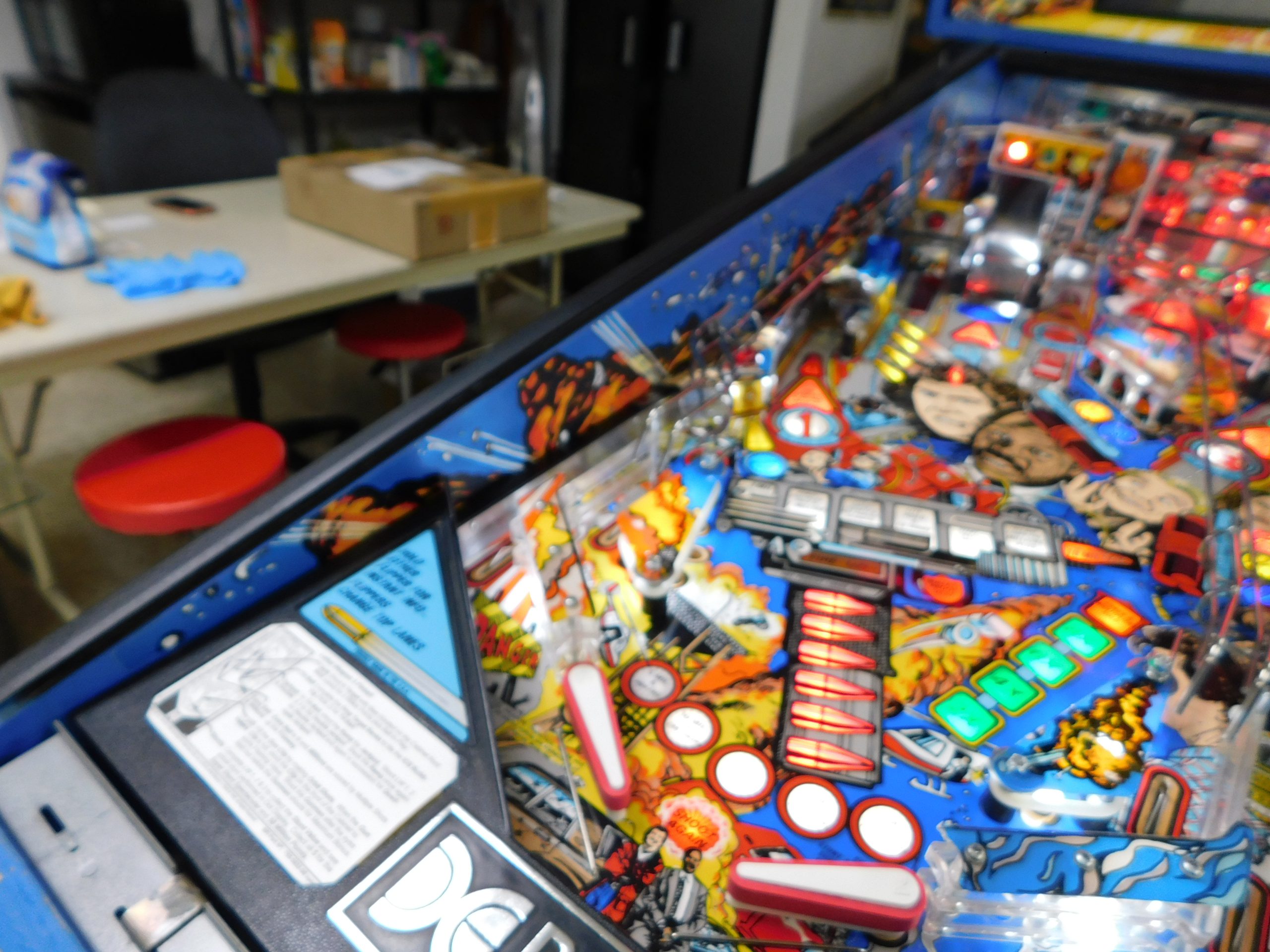 Playfield was disassembled, cleaned, polished and waxed. All playfield plastics and metal were washed and polished. Broken playfield plastics were replaced. Game was converted to LED bulbs. Playfield inserts were cleaned underneath to remove EMF dust. All flippers and bumpers were fully rebuilt with new parts above and below the playfield. New rubber bands were installed.