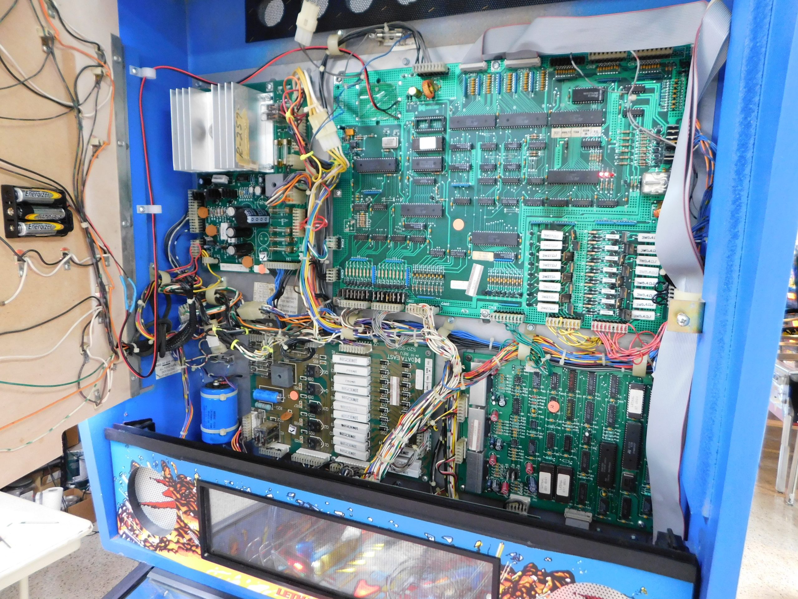 Legs were cleaned and polished, new leg bolts and leg adjusters were installed. All boards were removed and serviced for reliability. Battery was remoted off board. Backbox sides had typical damage to them. Wood was filled and sanded and painted. New translite replaced the old faded one. New side art blade decals and speaker panel decals were added for some visual excitement. Game was vacuumed inside and washed inside and out. Original power cord was replaced for safety.