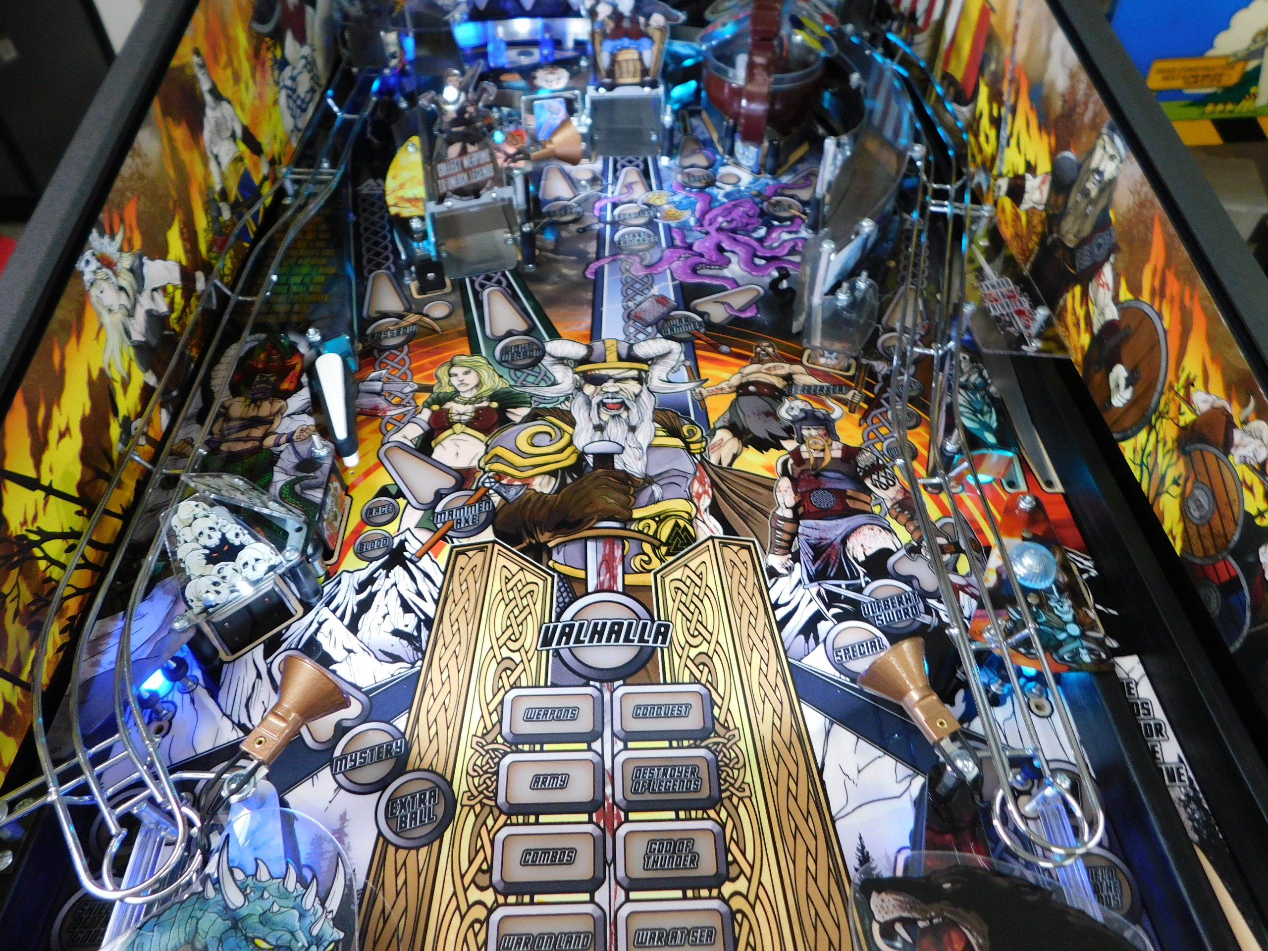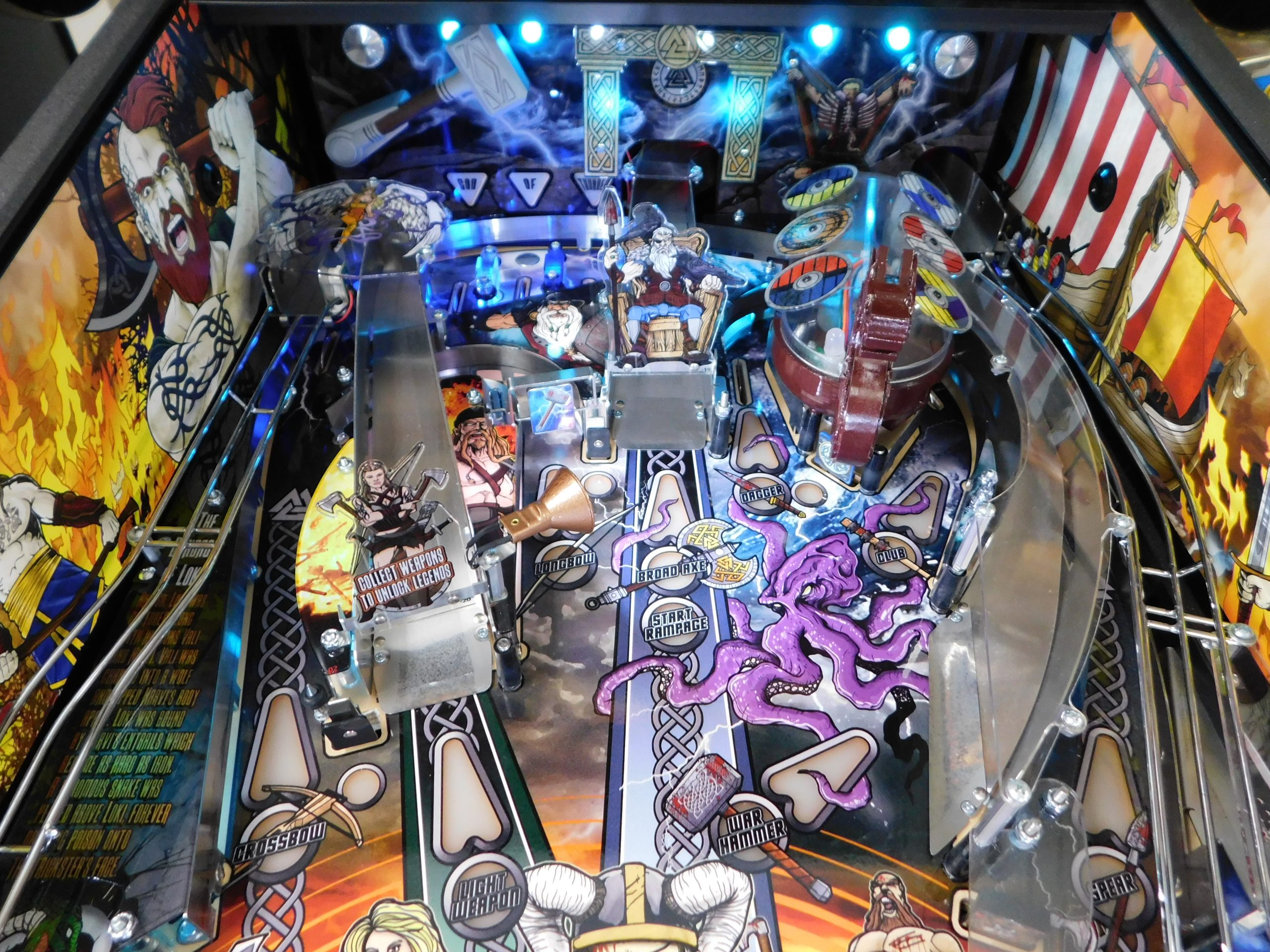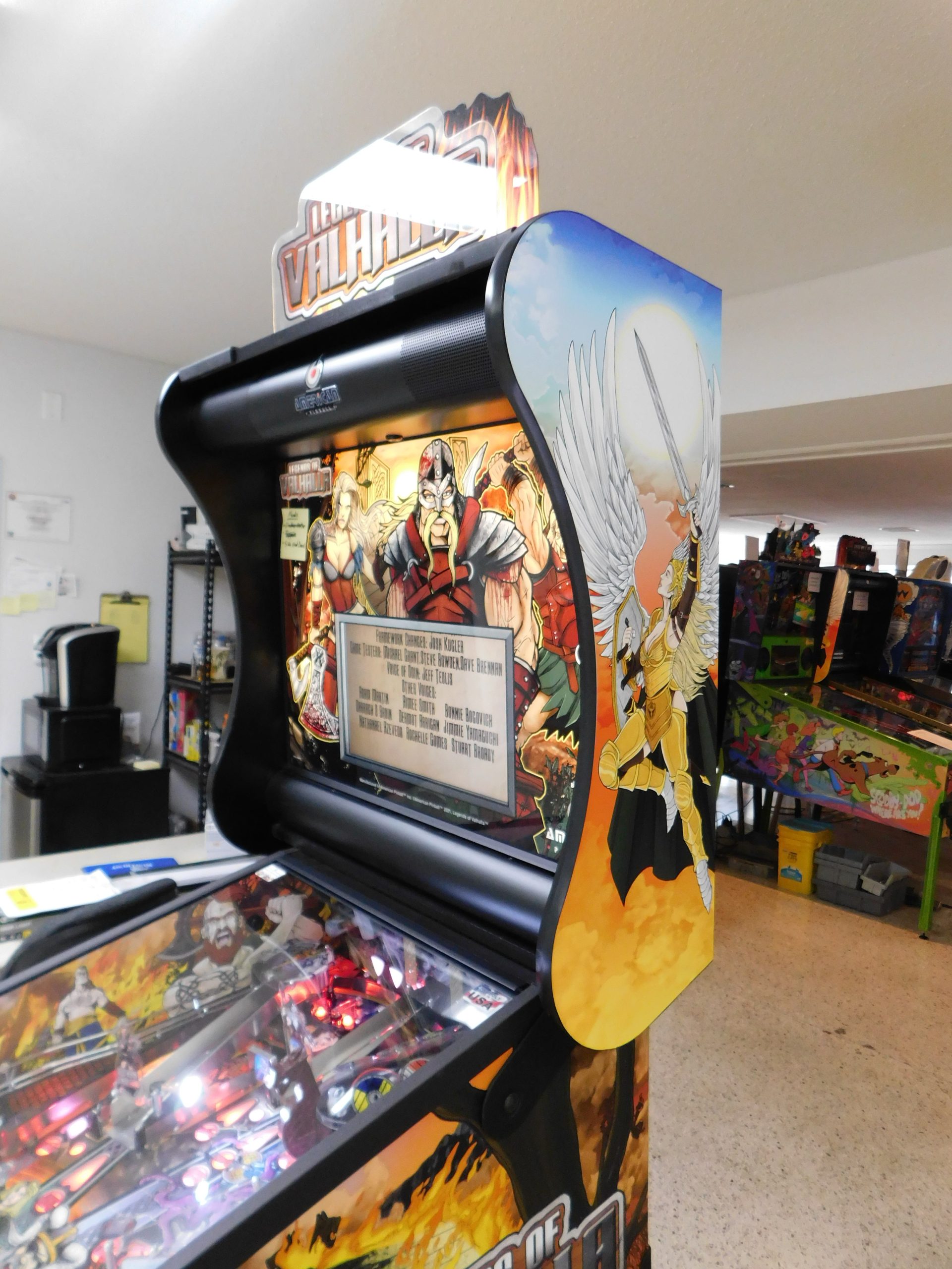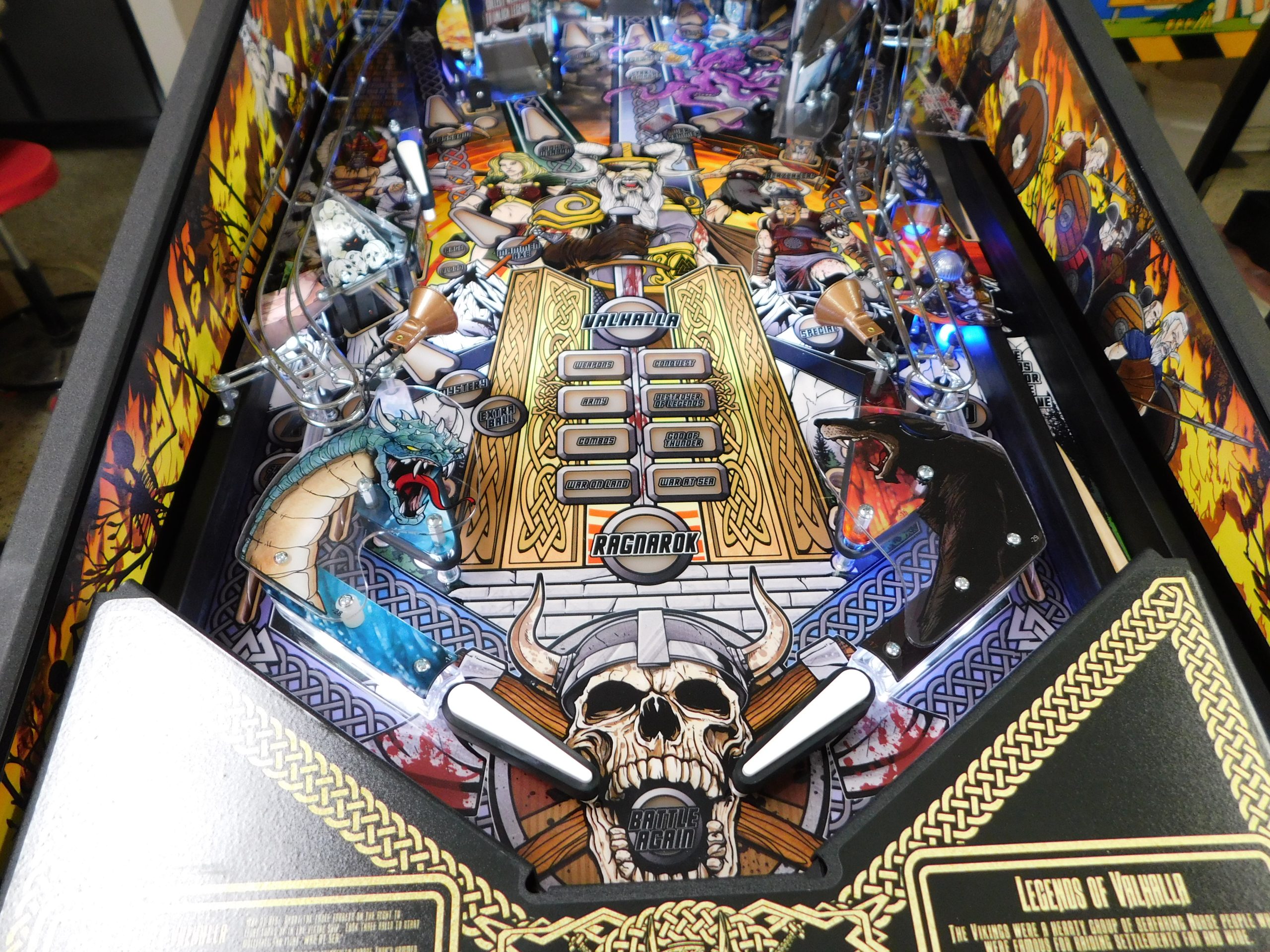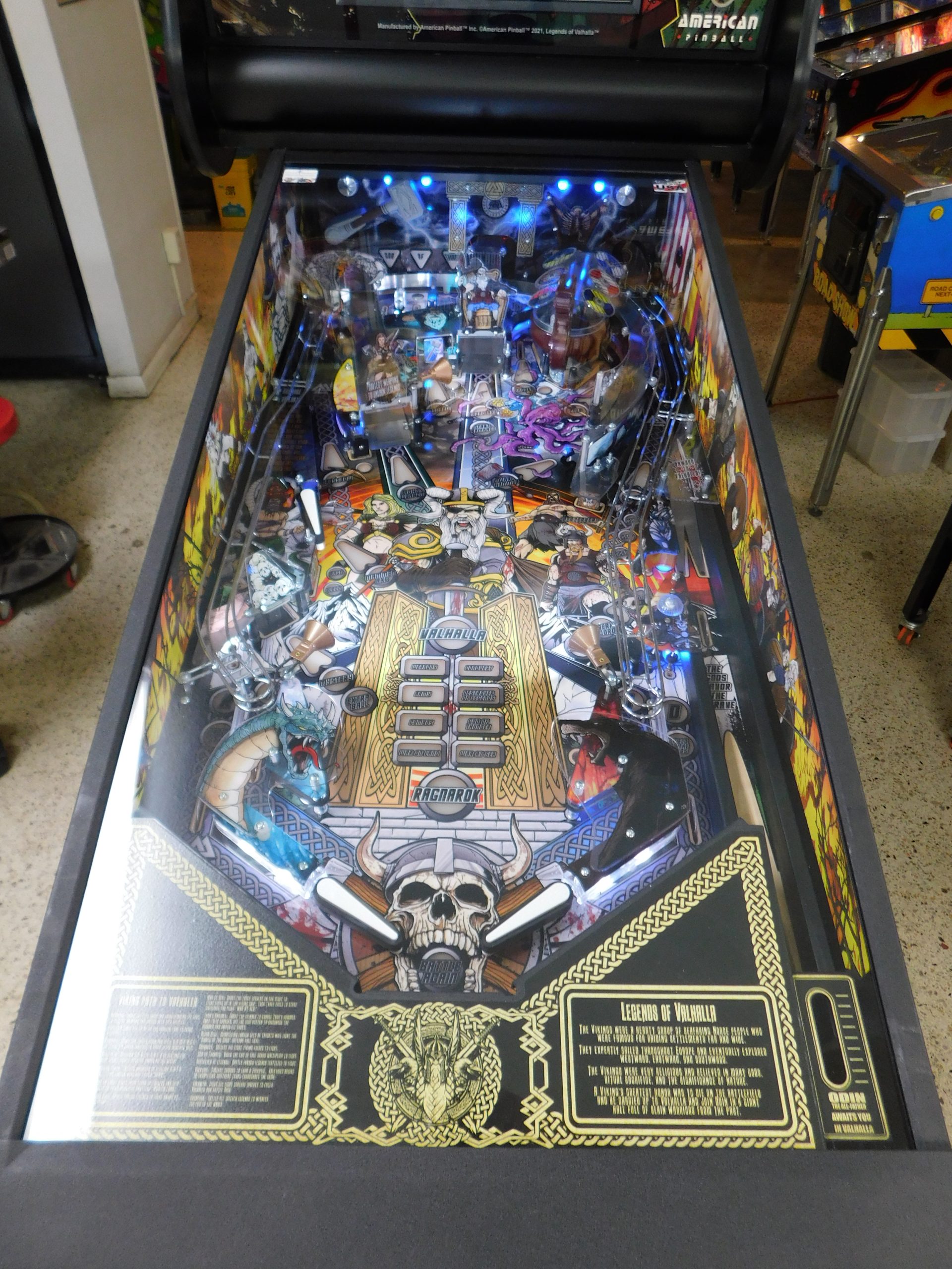 2022 American Pinball Legends of Valhalla (#1) (Classic Edition) (6 ball Multi-ball) (Shaker motor installed, Side art blade decals added, illuminated topper, 4 stereo speakers plus 8” cabinet subwoofer, Interactive Thor’s Hammer, Two under playfield magnets, New side head decals (outside), Upgraded to the latest game code)