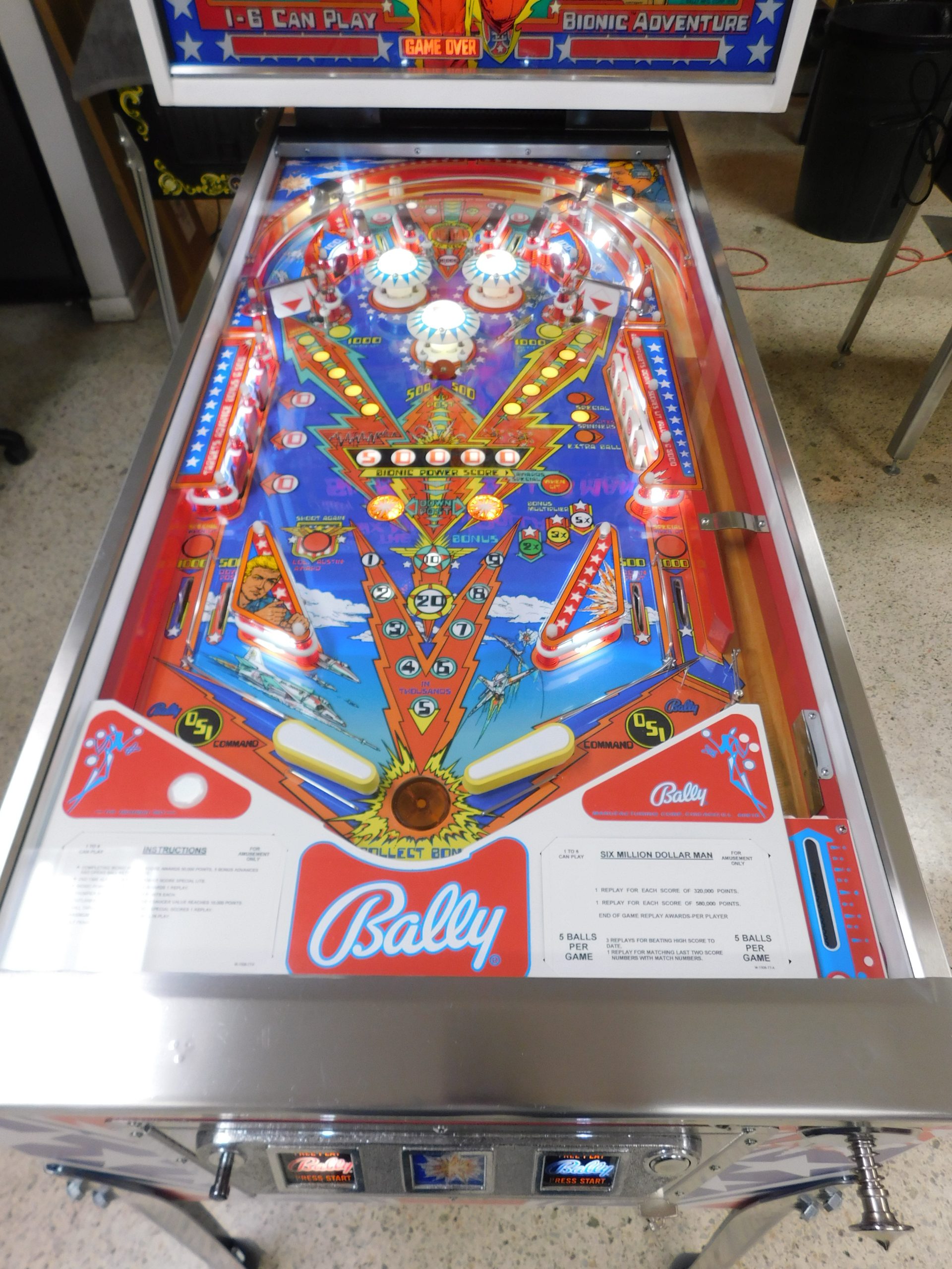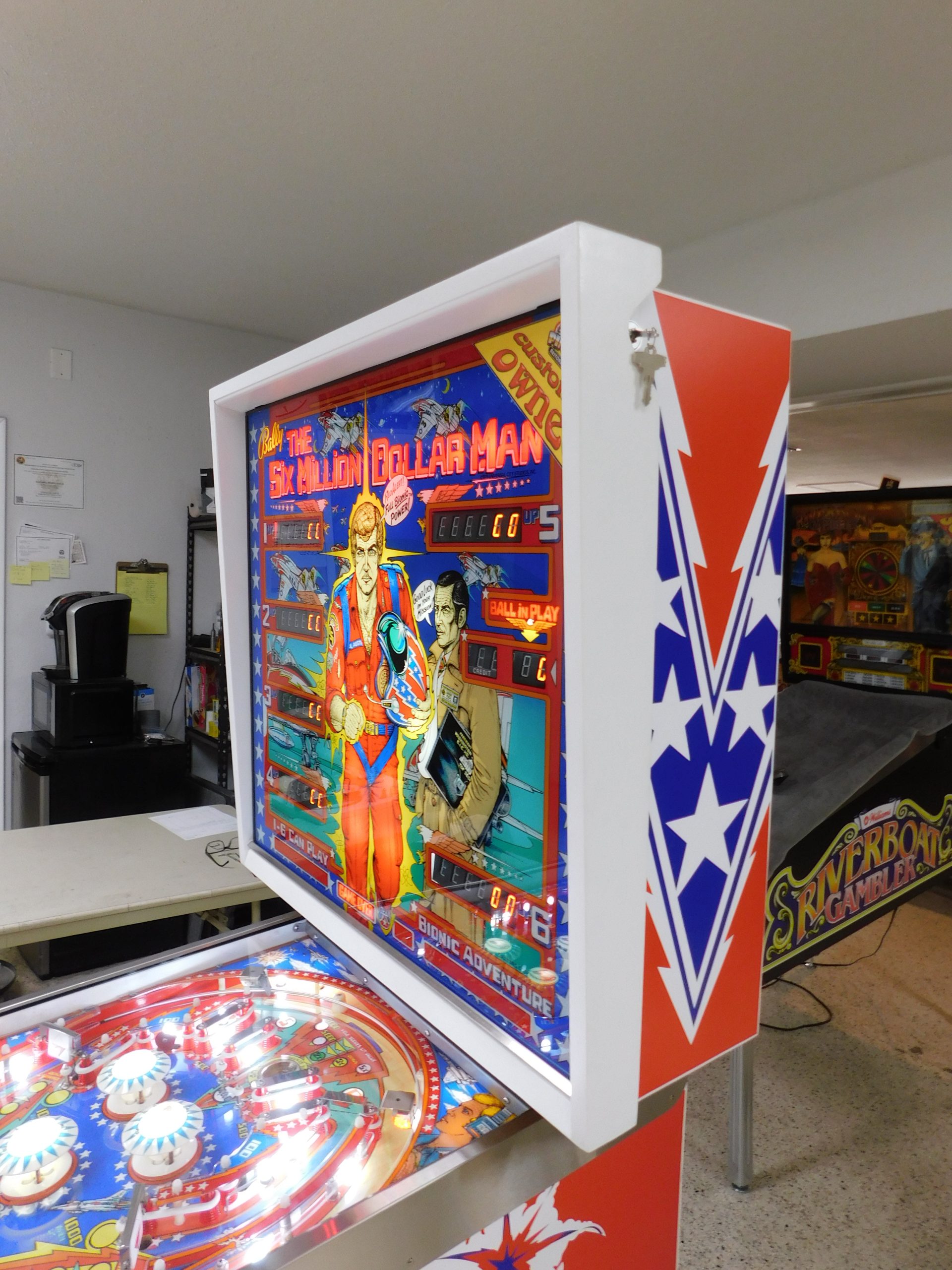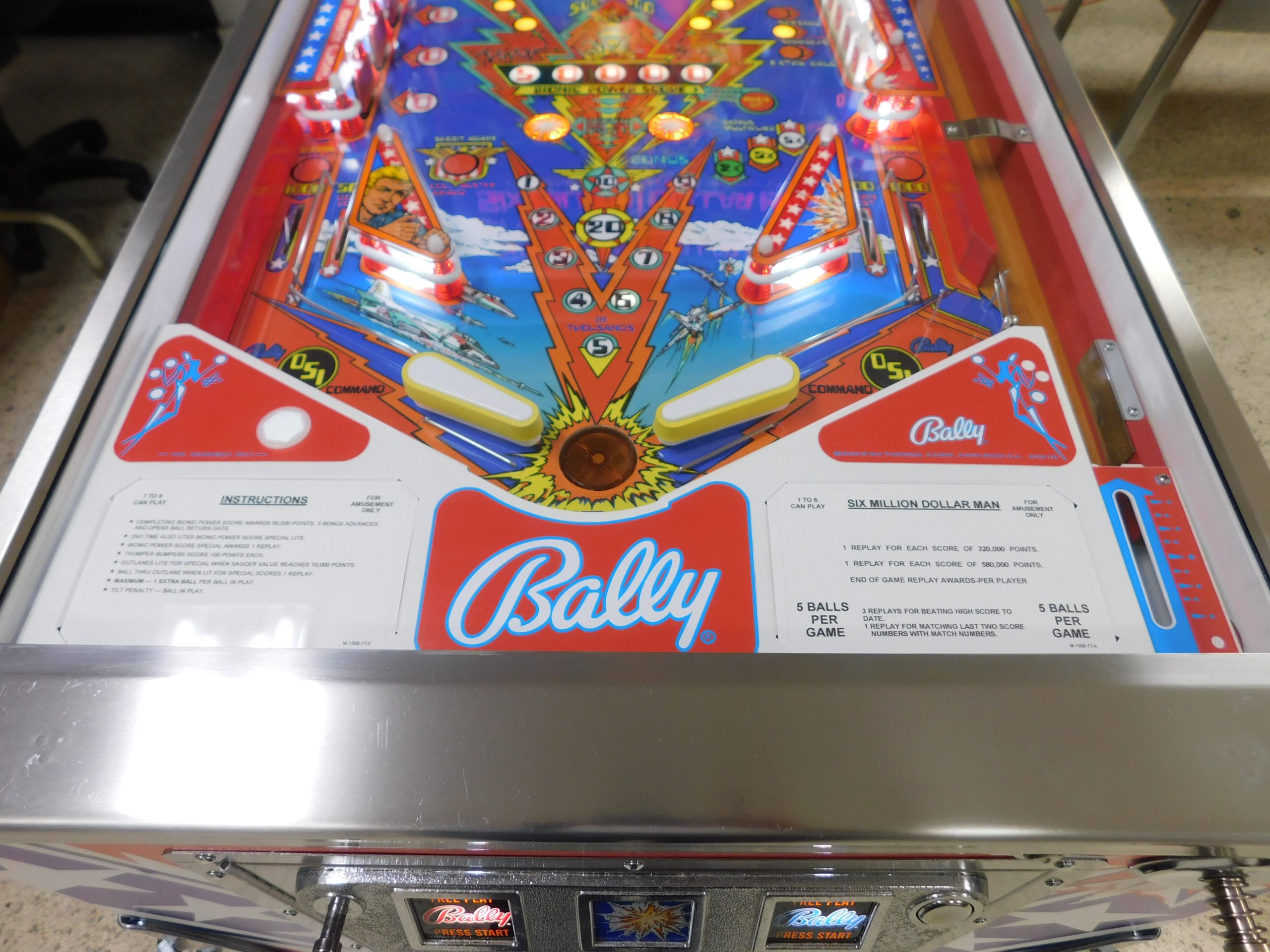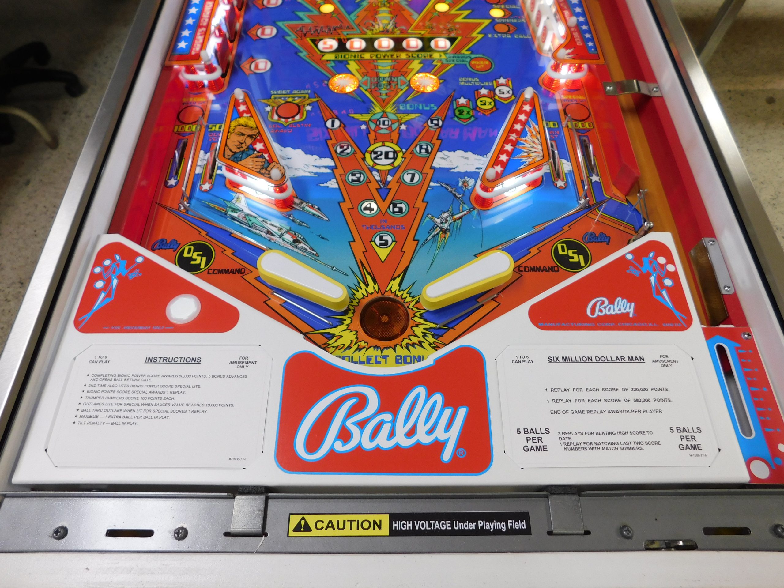 CUSTOMER RESTORATION – 1978 Bally Six million Dollar Man (#7) (New cabinet decals, playfield overlay, clear playfield protector, new MPU, new legs)