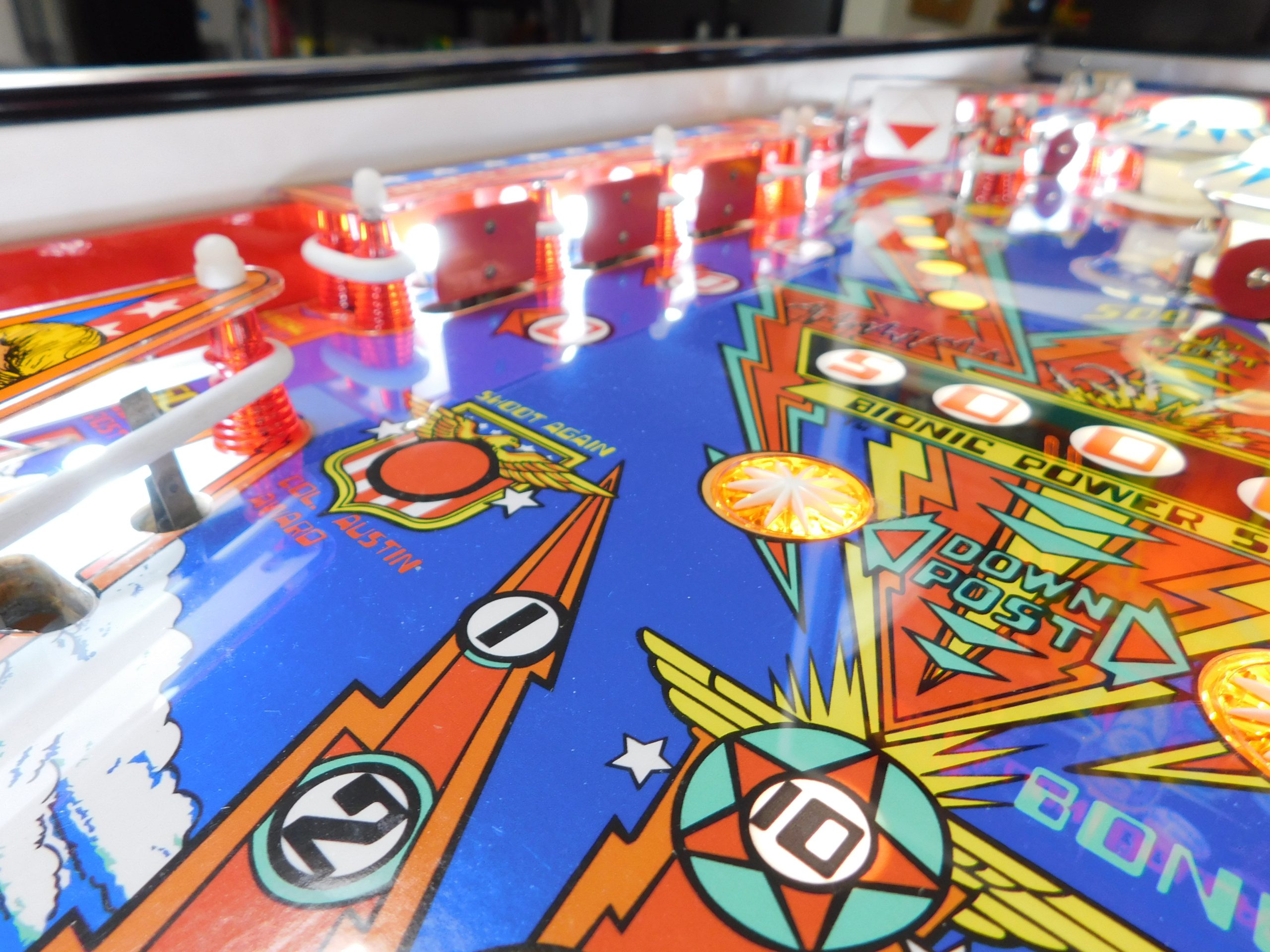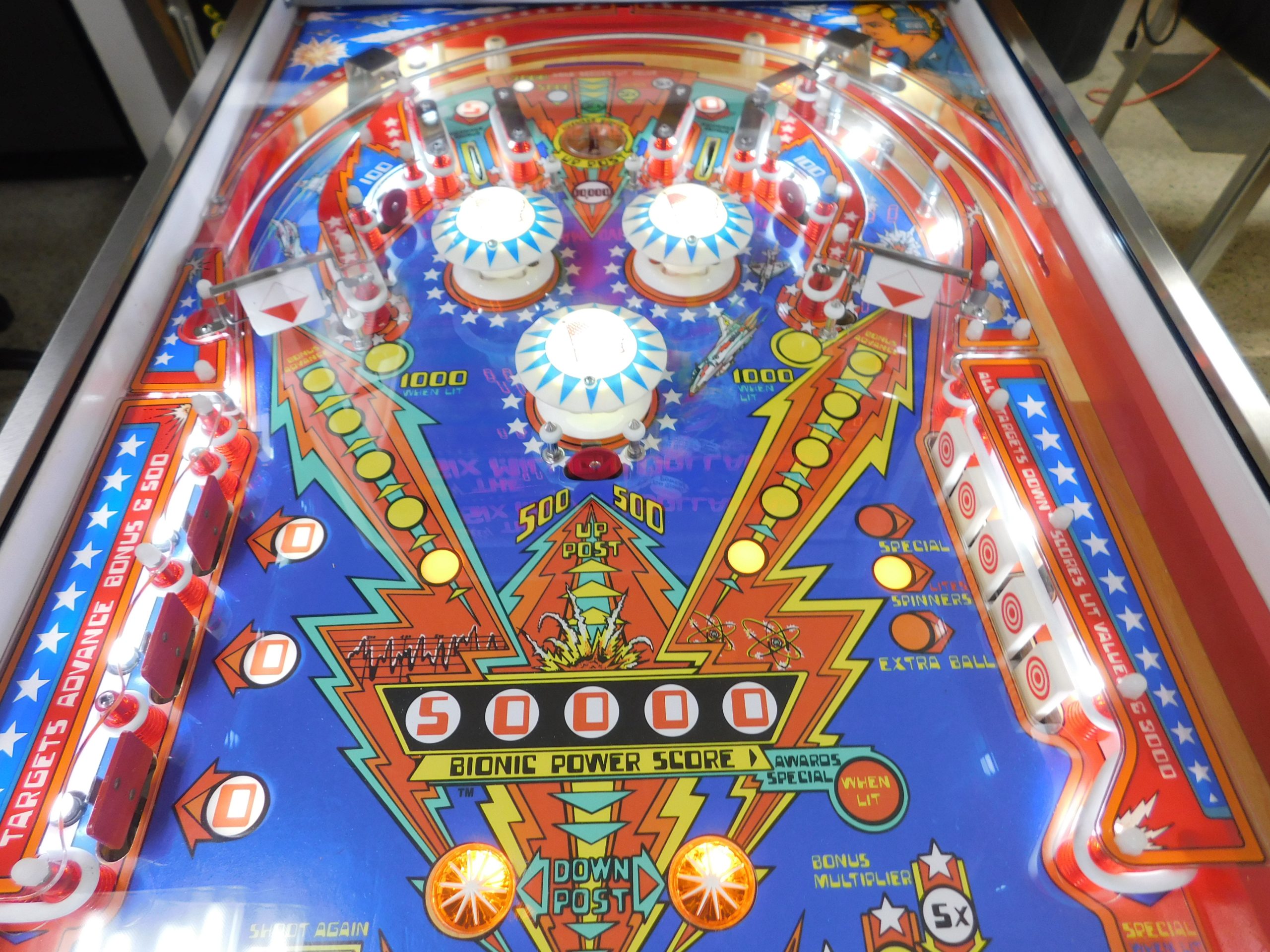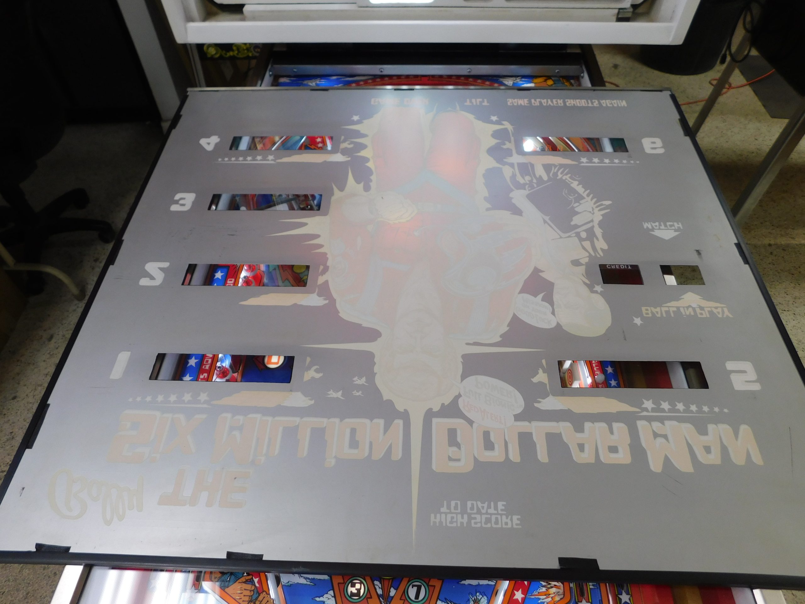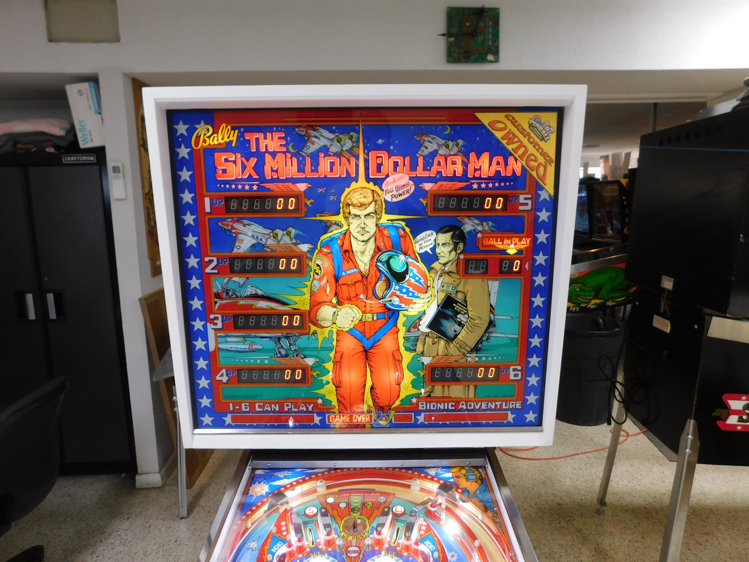 CUSTOMER RESTORATION – 1978 Bally Six million Dollar Man (#7) (New cabinet decals, playfield overlay, clear playfield protector, new MPU, new legs)